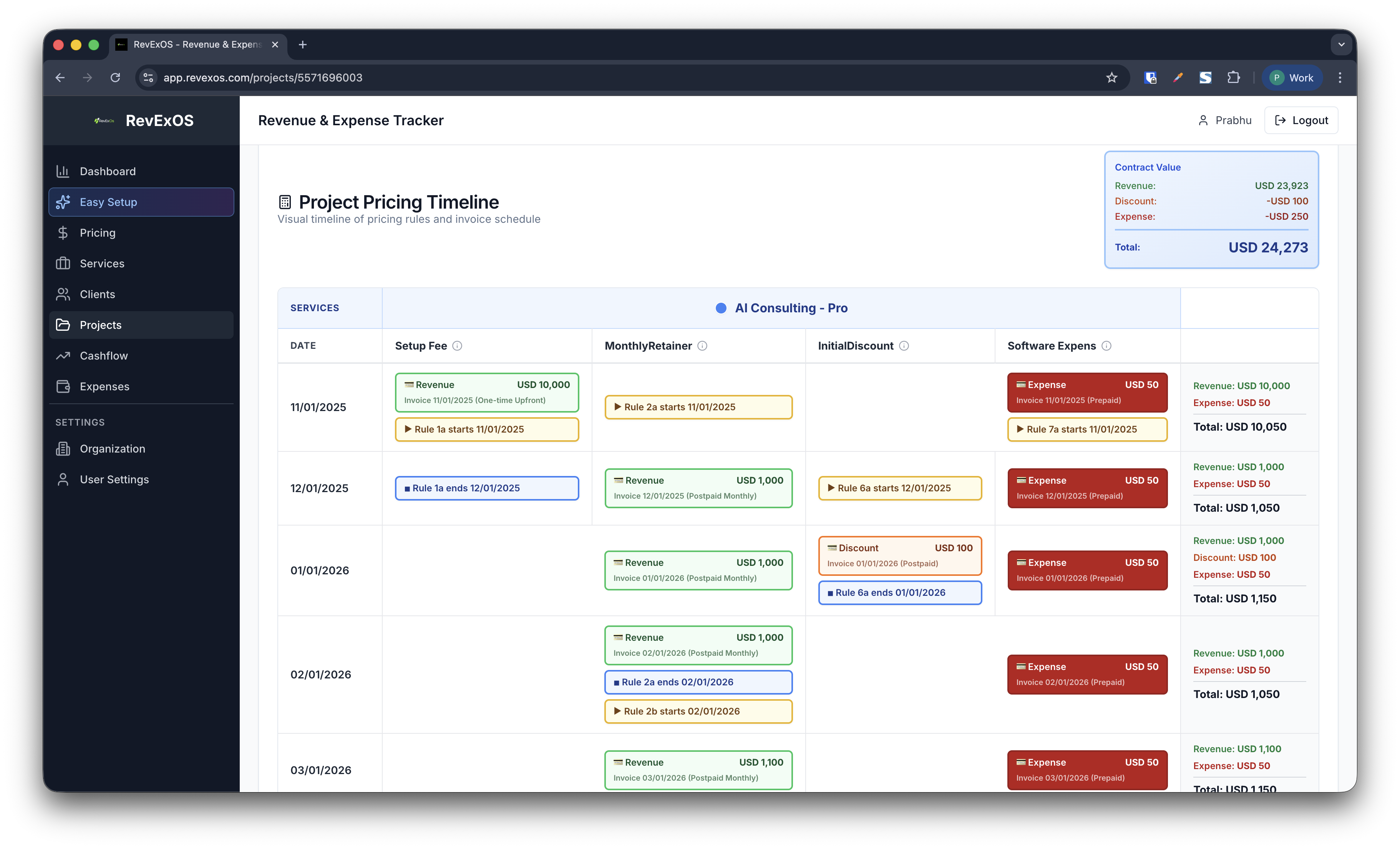 Instead of waiting for invoices to fail, RevExOS visualizes revenue over time.